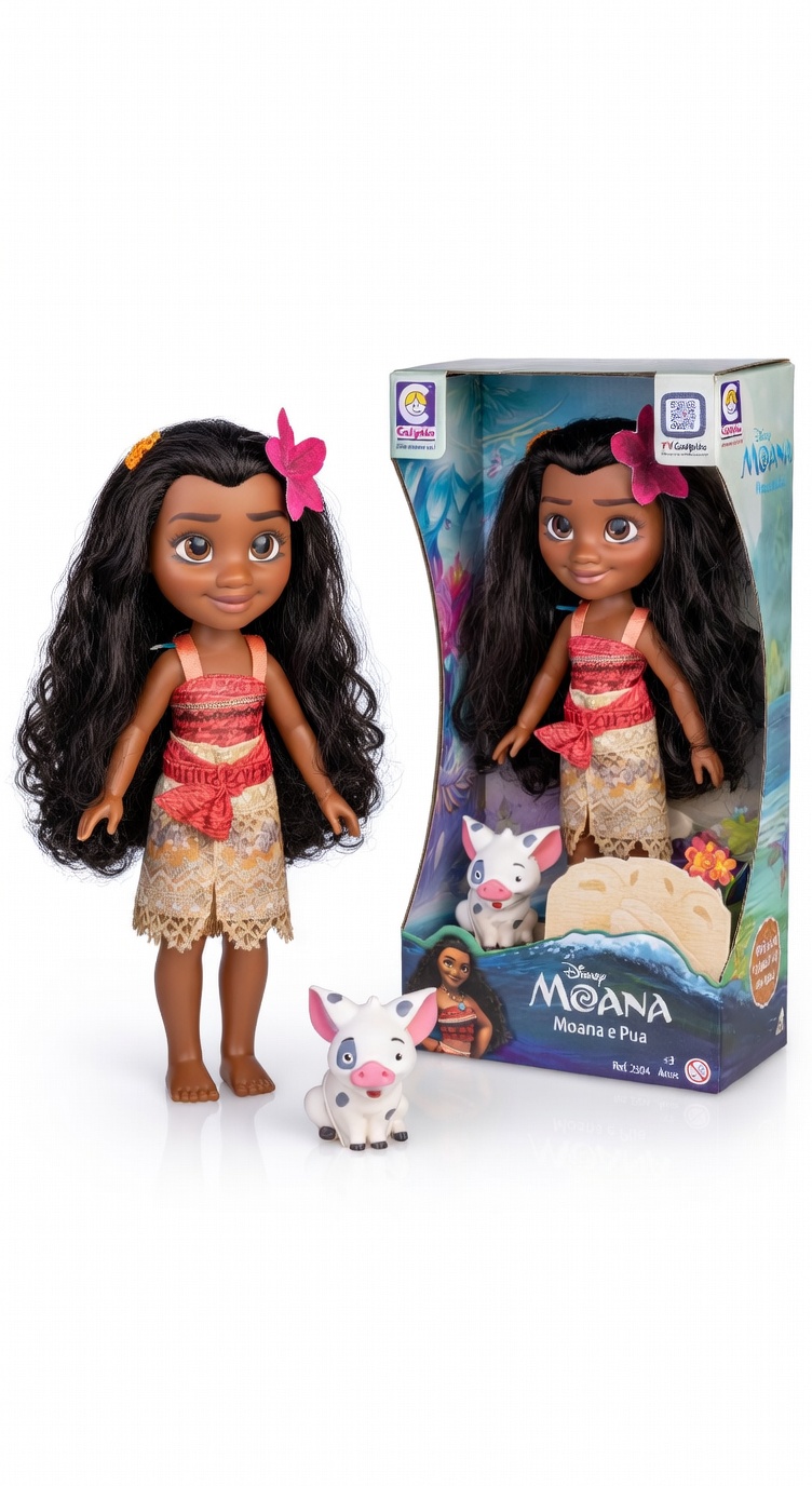 A princesa Moana chegou com seu companheiro inseparável, o porquinho Puá, para viver grandes aventuras ao seu lado! Direto dos mares da Polinésia para a sua casa, esta duplinha é perfeita para crianças que amam o universo Disney e desejam recriar suas cenas favoritas com fidelidade e encantamento.